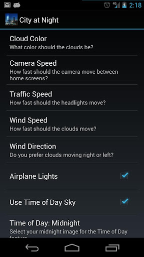 Moving clouds and streaks from the traffic enhance this beautiful long-exposure image of a city at night. Has full support for both portrait and landscape viewing, and responds to home screen switching! Lots of preferences for speeds, sky colors, time-of-day cycling, and more.